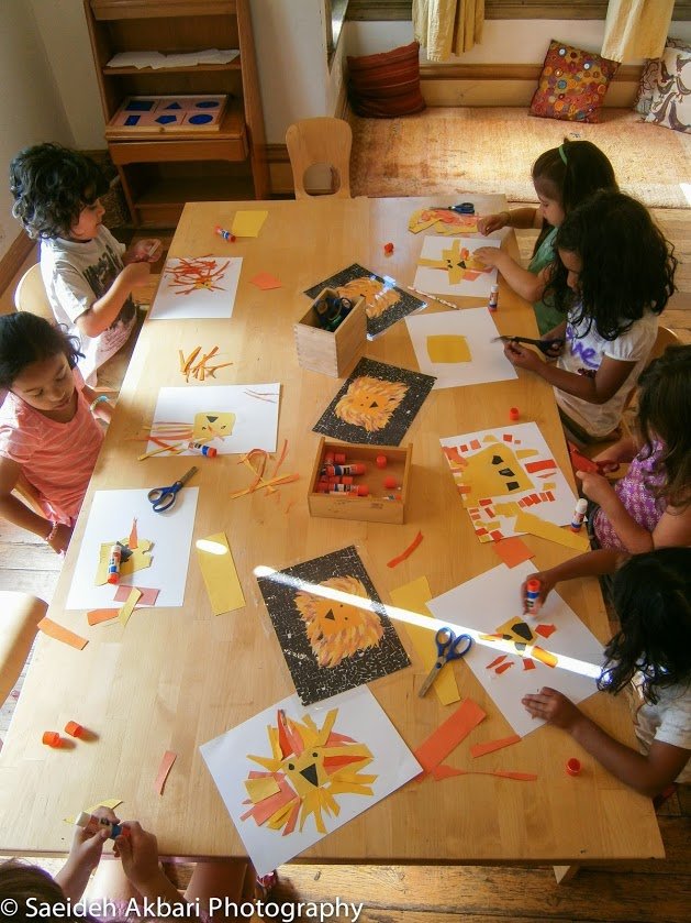 Most, though not all, models are repeated every year. Some are given a greater degree of complexity to adjust to the children’s growing developmental abilities. For example, in June (see below), while two-year-olds are given pre-cut pieces of paper to recreate the model’s lion’s mane in the collage, older children must cut their own pieces with scissors.